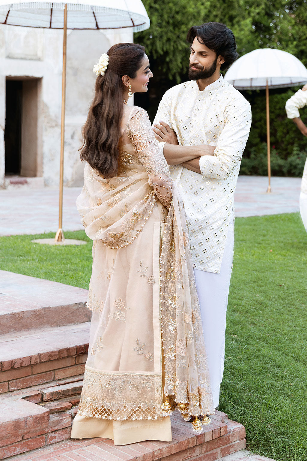 Step into understated luxury with this soft champagne-toned ensemble, exuding timeless elegance and modern refinement. The long straight shirt is delicately handcrafted with exquisite Resham and sequin embellishments, arranged in intricate floral vines and symmetrical motifs that highlight artisanal craftsmanship. The sheer organza sleeves, adorned with delicate embroidery, add grace and femininity to the silhouette. The look is completed with matching straight trousers for a clean, sophisticated finish and a coordinating organza dupatta featuring delicate scalloped edges, fine embroidery, and shimmering accents, making this outfit a perfect choice for weddings, receptions, or festive occasions.